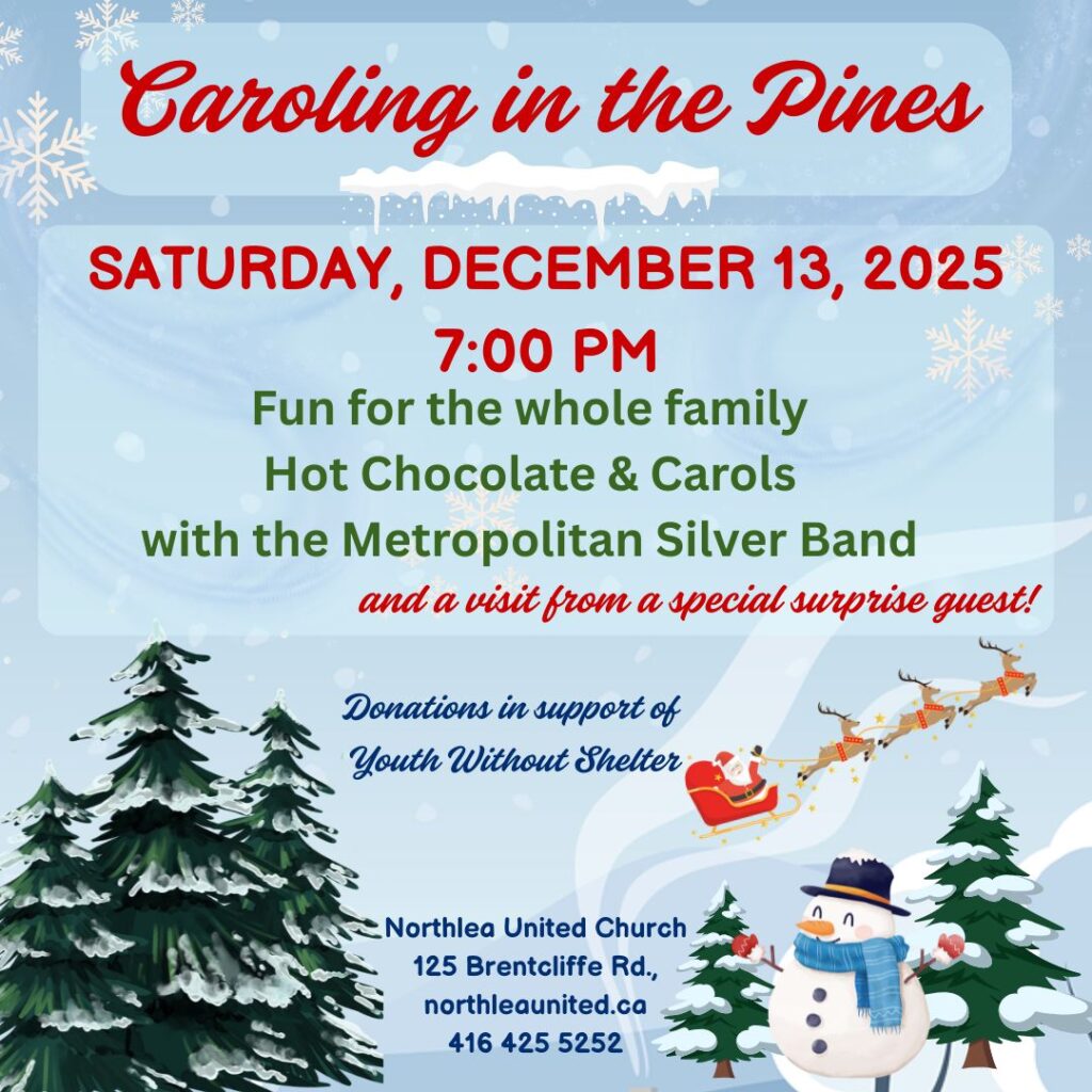 The whole neighbourhood will be at Northlea this evening to sing carols, listen to the Metropolitan Brass Band, drink Hot Chocolate and maybe even donate a litte to Youth Without Shelter! And don’t forget! We always have a special guest! 7:00 – 8:00 pm