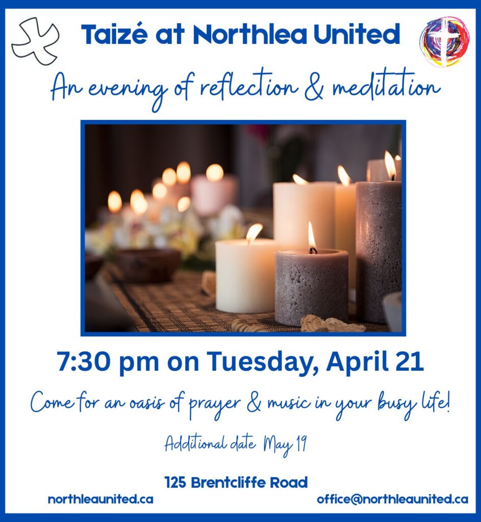Looking for a quiet centering in the middle of your busy week? Come to Northlea United for Taizé – a blend of prayer and music for the soul.