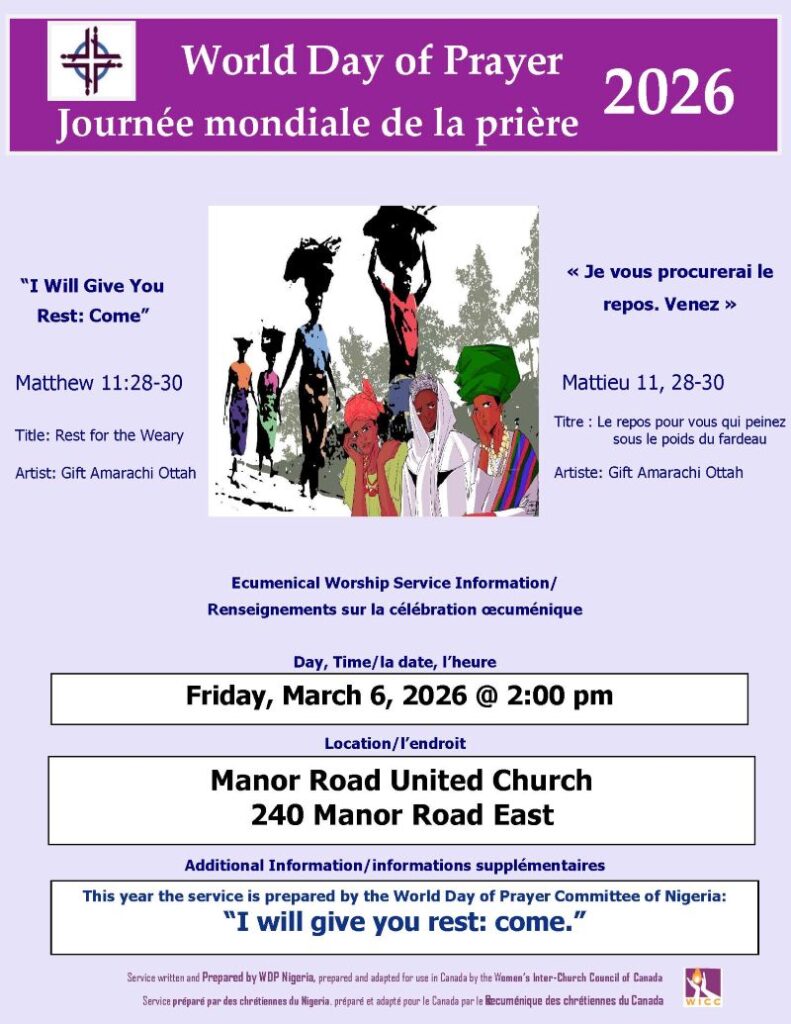 We will gather with other area churches at Manor Road United (240 Man or Road East) at 2:00 pm on Friday, March 6, 2026 to celebrate the World Day of Prayer and learn about worship and faith around the world.